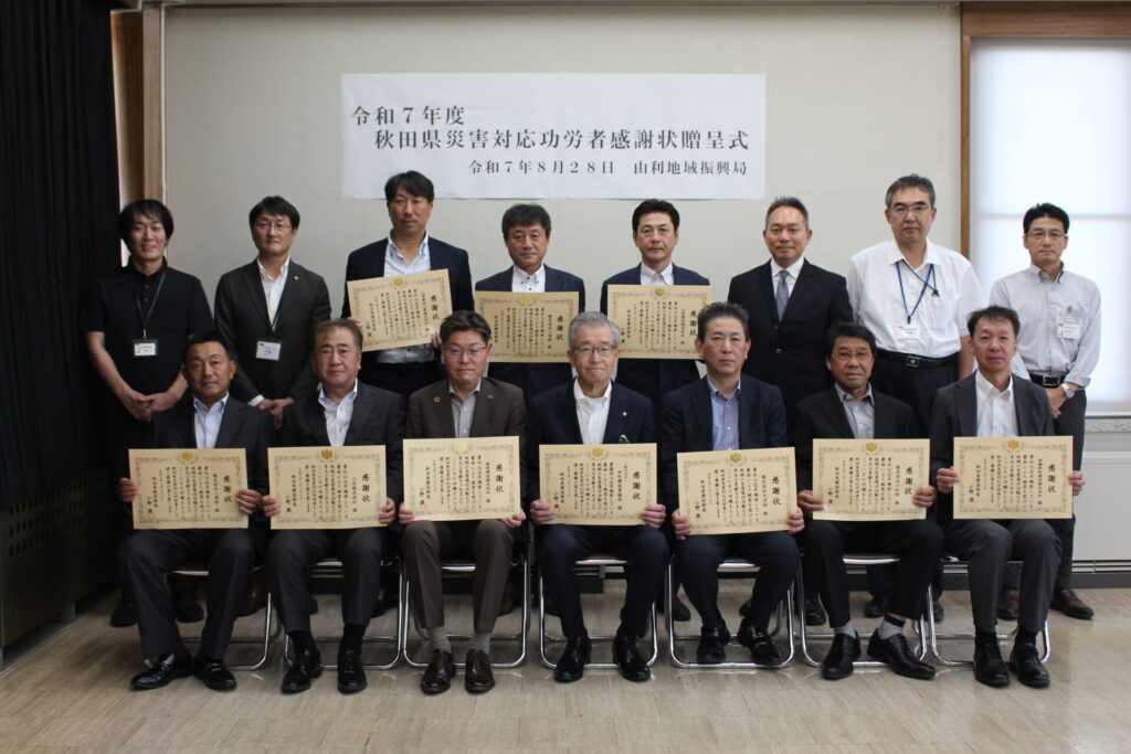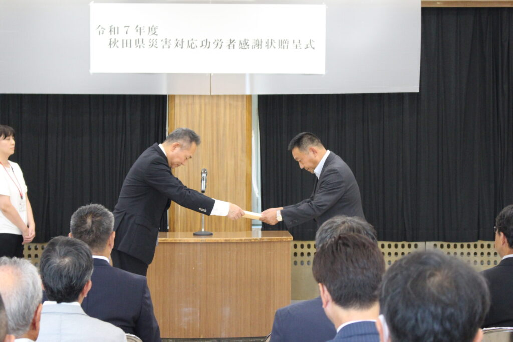豪雨災害など社会的に影響が大きい災害の発生時に、公共土木施設等に対する応急対策活動の功績が認められ、由利地域振興局長より感謝状が贈呈されました。